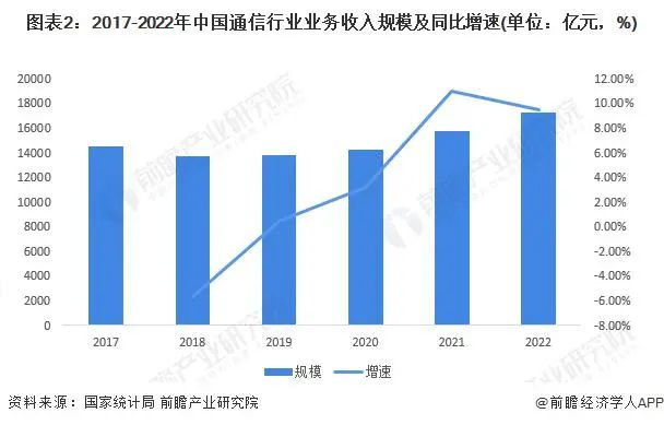 根據(jù)國(guó)家統(tǒng)計(jì)局的數(shù)據(jù),2017-2022年,中國(guó)通信行業(yè)業(yè)務(wù)收入規(guī)模呈緩步上升趨勢(shì),2022年約為1.73萬億元,同比增長(zhǎng)9.48%。目前行業(yè)缺乏換代型的產(chǎn)品,市場(chǎng)需求基本飽和,但隨著5G等新技術(shù)的加快應(yīng)用,行業(yè)有望迎來新的增長(zhǎng)期。