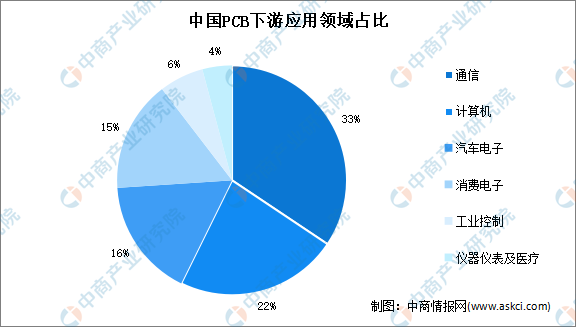 數(shù)據(jù)顯示,中國(guó)PCB下游應(yīng)用領(lǐng)域占比最高的是通信,達(dá)到33%;其次是計(jì)算機(jī),占比約為22%。其他下游領(lǐng)域PCB市場(chǎng)規(guī)模較大的是汽車電子、消費(fèi)電子,占比分別為16%、15%。